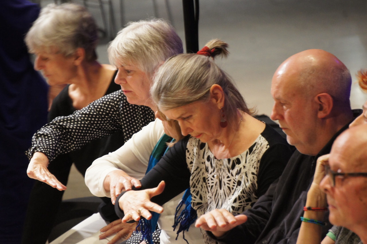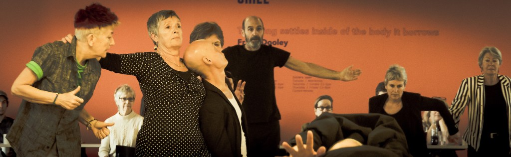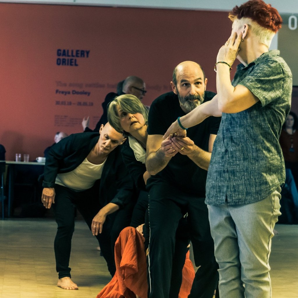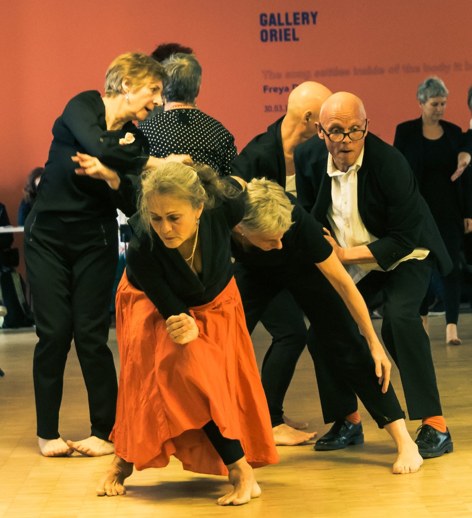 The work was shown in different public settings, including the café at Chapter Arts Centre and the foyer of the Royal Welsh College of Music and Drama (both Cardiff), the BBC Hall and Elysium Gallery in Swansea, and the Small World Theatre in Cardigan. The programme at Small World Theatre included students from the Department of Theatre, Film and Television Studies at Aberystwyth University (under the direction of Dr Louise Ritchie), who, after showing their own choreography, joined GNFTF in a short improvisation – a fascinating and dramatic collision of bodies of different ages.